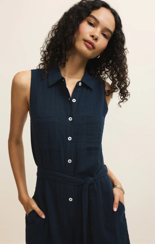 One and done at its finest, this 100% cotton romper is sure to be a go-to look. Its button front makes getting dressed a breeze while its lightweight feel allows for all-day comfort. Side pockets, a tie belt, and collar keep you looking put-together.