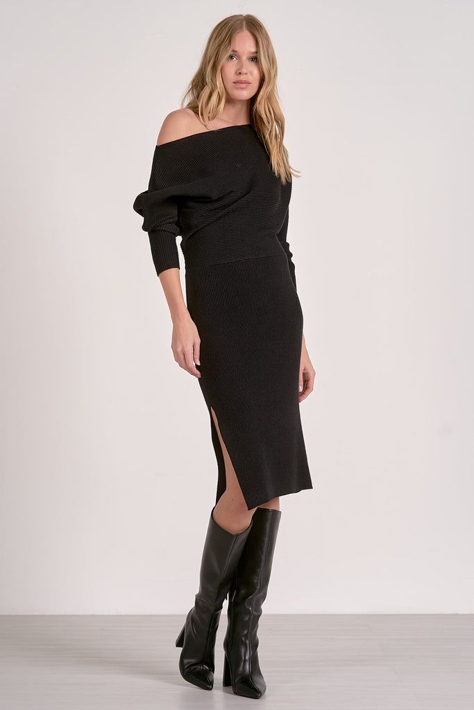 Make a striking impression with the Elan Off Shoulder Sweater Dress — a beautifully rib-knit, cozy piece that combines elegance with comfort. This black midi dress gracefully falls off one shoulder, creating an effortlessly chic look that feels natural yet polished. Featuring a form-fitting waist and a sleek side slit, it’s a stylish staple for autumn evenings, from romantic dinners to fashionable gatherings. Crafted from a soft, stretchy knit, the dress moves with you and pairs flawlessly with tall boots and bold accessories for a timelessly sophisticated outfit.