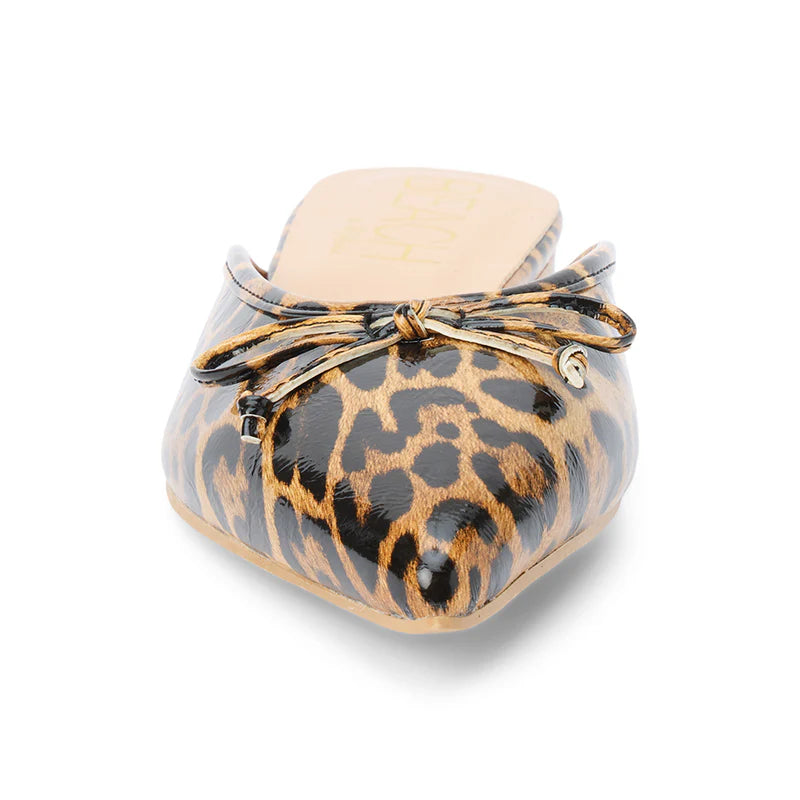 Vegan faux patent leather flat mule with pointed toe and petite bow detail.