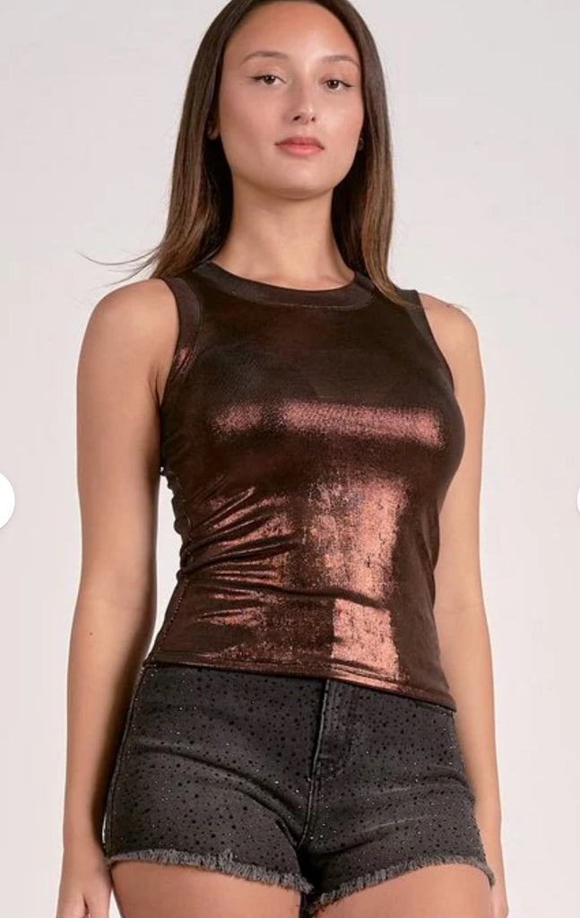 Add instant shine to your holiday rotation with the Harper Glitter Tank. Cut in a slim, sleeveless fit with a touch of stretch, this metallic top is available in black, champagne, or chocolate. Dress it up with tailored trousers or down with wide-leg denim for casual glam.