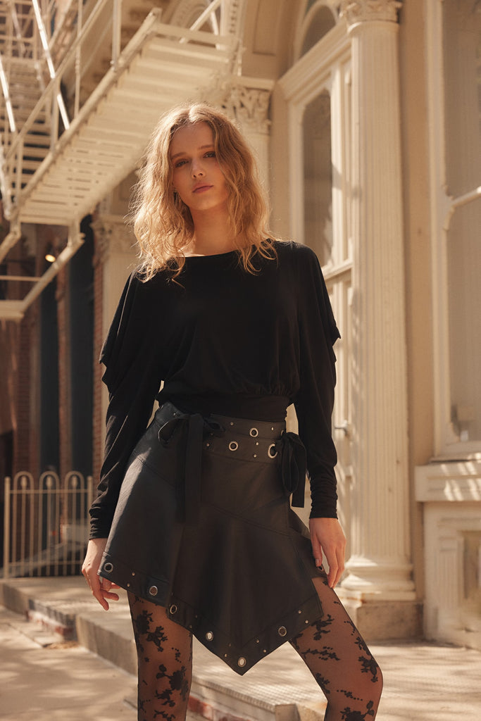 Intentional draping adds a modern touch to this staple long sleeve, featured in a luxe, so-soft jersey fabrication with voluminous, draped shoulders, fitted forearms, and a bubbled bodice.
