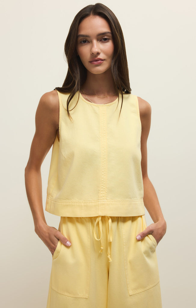 Soft and structured, this twill tank offers a modern twist on denim-inspired style. The fabric has a smooth, sun-washed feel that’s perfect for everyday wear. Pair it with your favorite bottoms for a relaxed look that feels pulled together.