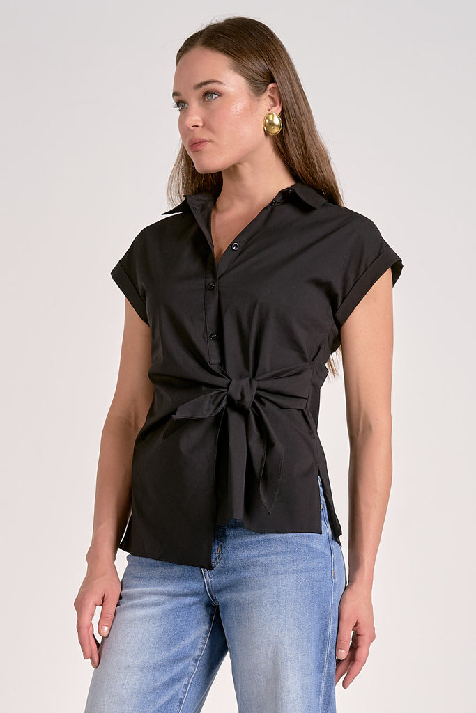 Elevate your denim look with the Elan Button Down Tie Waist Shirt. Featuring a timeless collar, short sleeves, and front button closures, this shirt also highlights a flattering tie detail at the waist for added style and shape.
